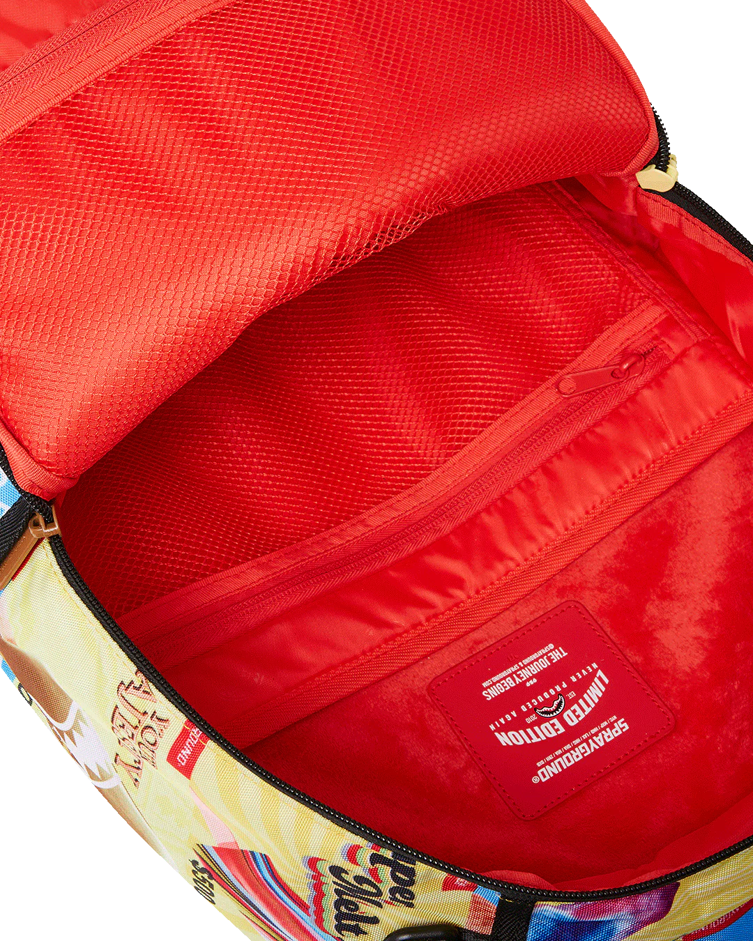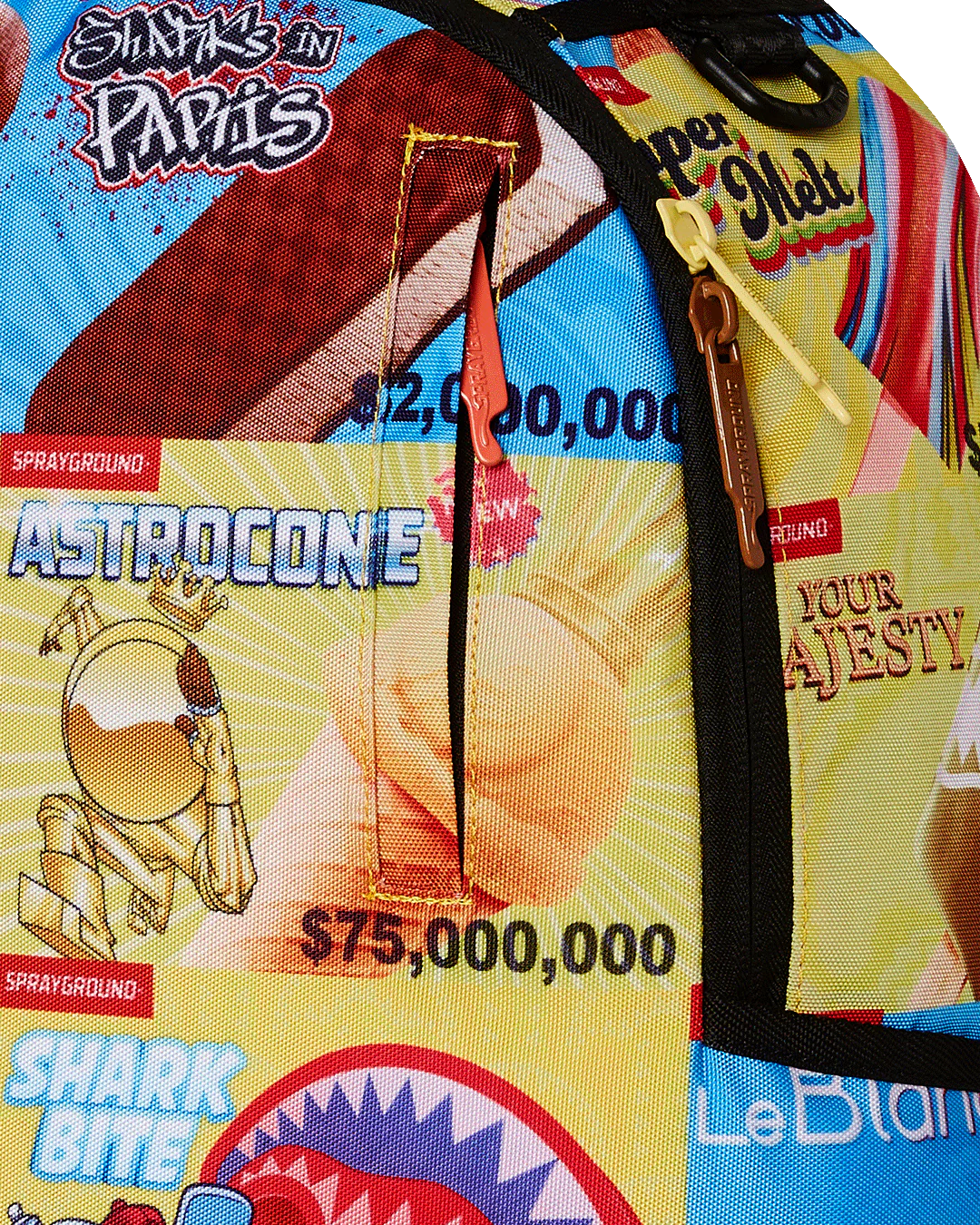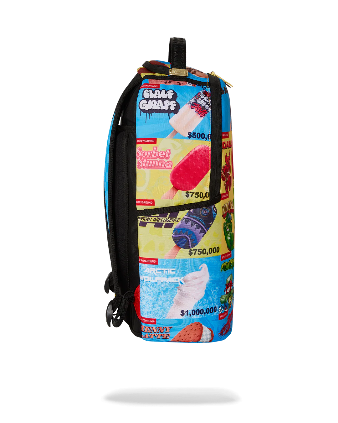 Dimensions: 18″ x 6″ x 11.5″ • Front zipper pocket • Side pockets • Zippered Stash pocket • Separate velour sunglass compartment • Ergonomic mesh back padding • Adjustable Straps for custom sizing • Gold zippers with metal hardware • Metal “Sprayground Authentic” badge • Slide through back sleeve connects to carry-on luggage to free your hands